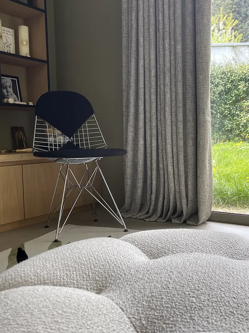 L’un des défis techniques de ce projet résidait dans la pose de rails dissimulés de plus de 8 mètres de longueur, pour habiller de très grandes baies vitrées donnant sur le jardin. Grâce à un travail de précision de notre poseur et de nos couturières, les rideaux glissent parfaitement, offrant une ouverture fluide et une retombée impeccable.